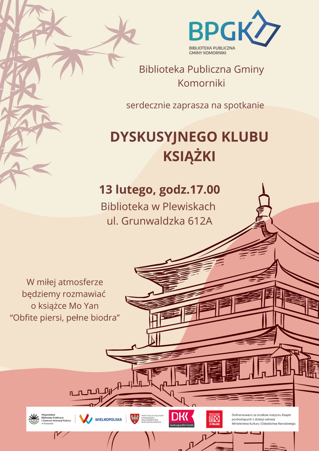 13 lutego (czwartek ) 2025 roku, o godzinie 17:00 serdecznie zapraszamy na spotkanie Dyskusyjnego Klubu Książki. Spotkanie odbędzie się w Bibliotece w Plewiskach ul. Grunwaldzka 612 a w miłej atmosferze rozmawiać będziemy o książce Mo Yan “Obfite piersi, pełne biodra”.