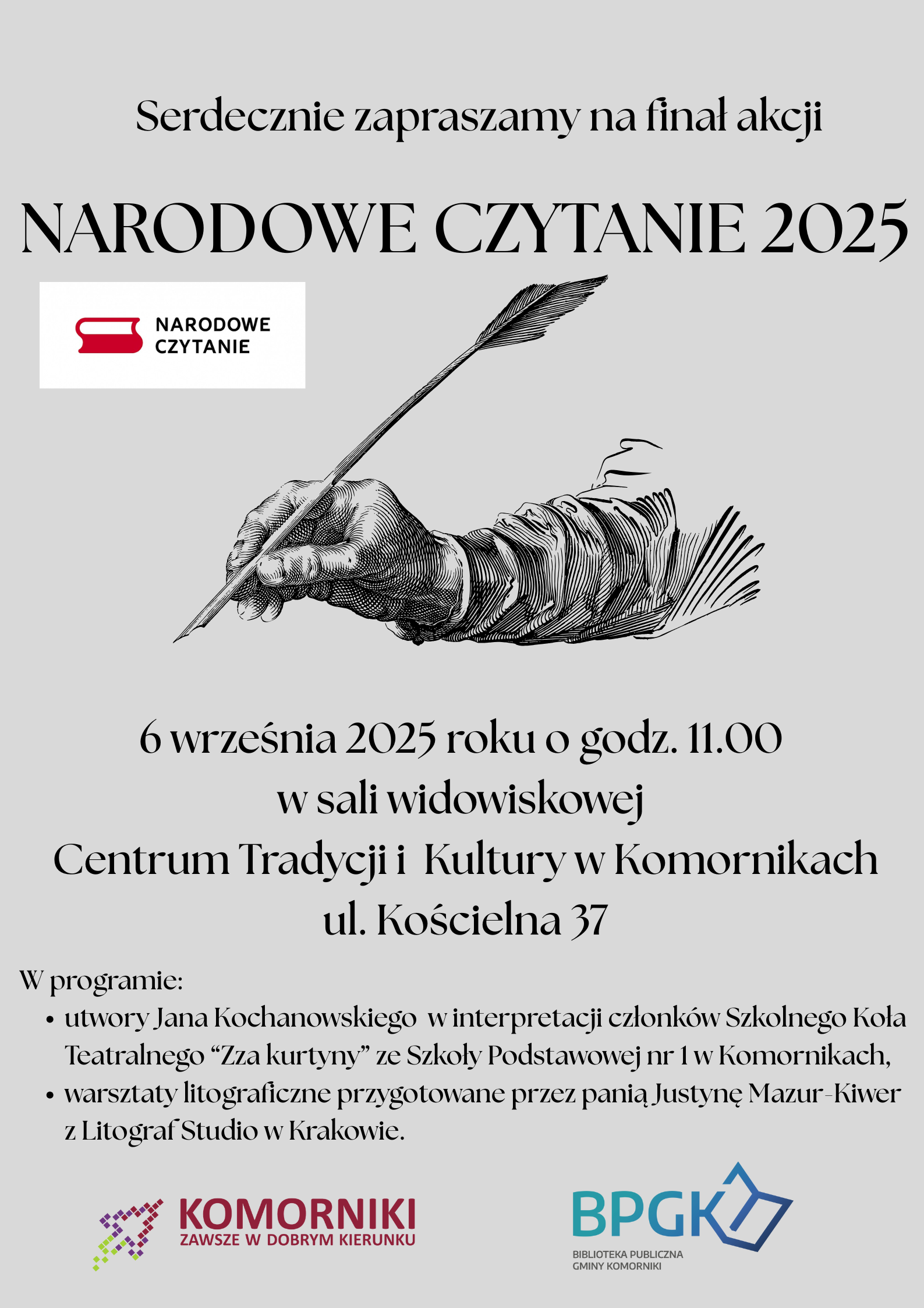 Serdecznie zapraszamy na finał akcji Narodowe Czytanie 2025, który odbędzie się 6 września 2025 roku o godz. 11:00 w sali widowiskowej Centrum Tradycji i Kultury w Komornikach (ul. Kościelna 37).